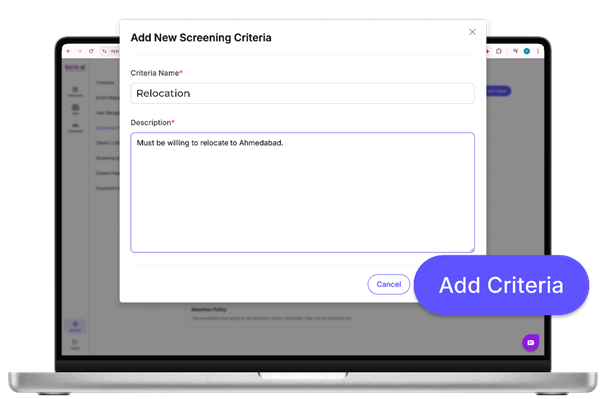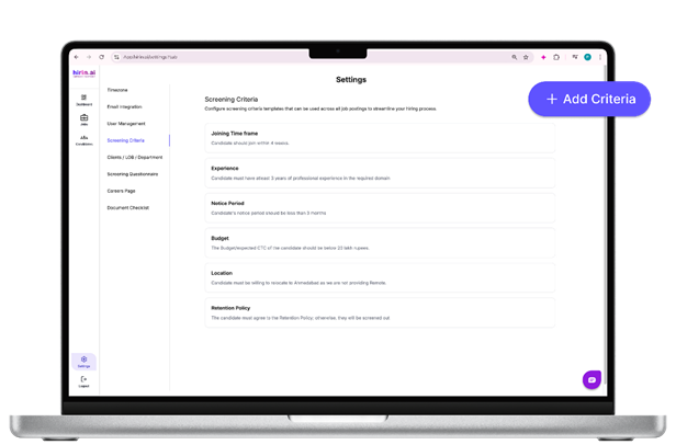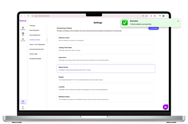 This guide explains how to create new screening criteria in Hirin.ai. Screenshots are included to help you navigate the feature.